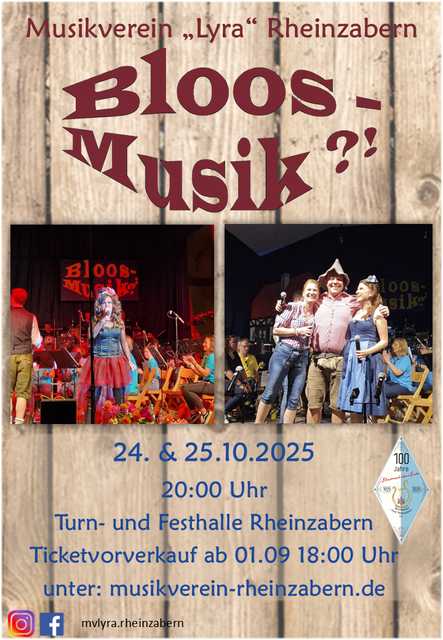am 24. und 25. Oktober werden wir wieder unseren traditionellen und einzigartigen bunten Abend unter dem Motto „Bloos-Musik?!“ veranstalten. Beginn ist jeweils um 20 Uhr in der Turn- und Festhalle Rheinzabern.