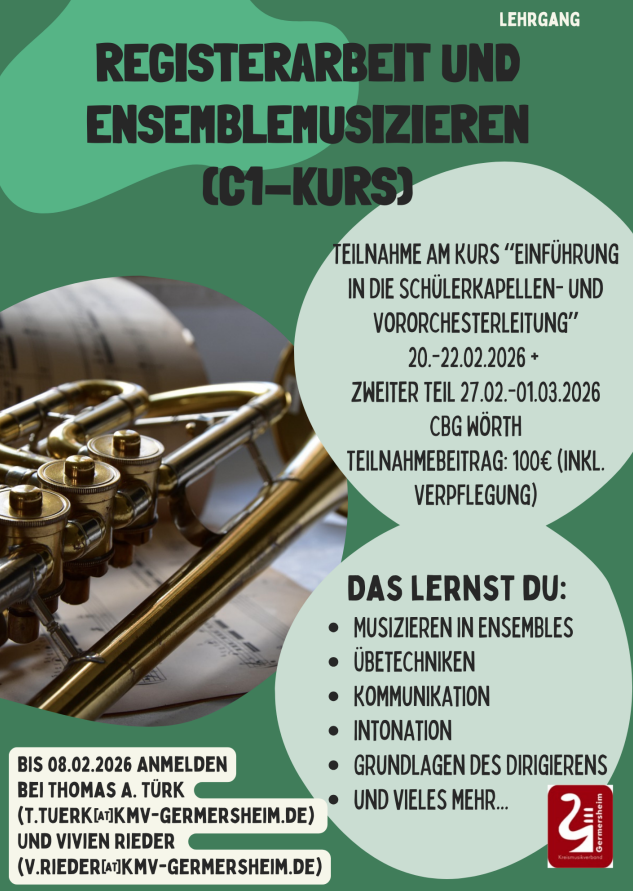 Workshopangebot: Auch in diesem Jahr finden wieder unsere beiden Kurse "Einführung in die Schülerkapellen und Vororchesterleitung" und "Registerarbeit und Ensemblemusizieren" statt. Unsere beiden Dozenten Vivien Rieder und Thomas Türk werden jeweils vom 20. bis 22. Februar 2026 bzw. 27.02. bis 01.03.2026 spannende Einblicke in die Aufgaben eines Dirigenten und Registerführers geben.