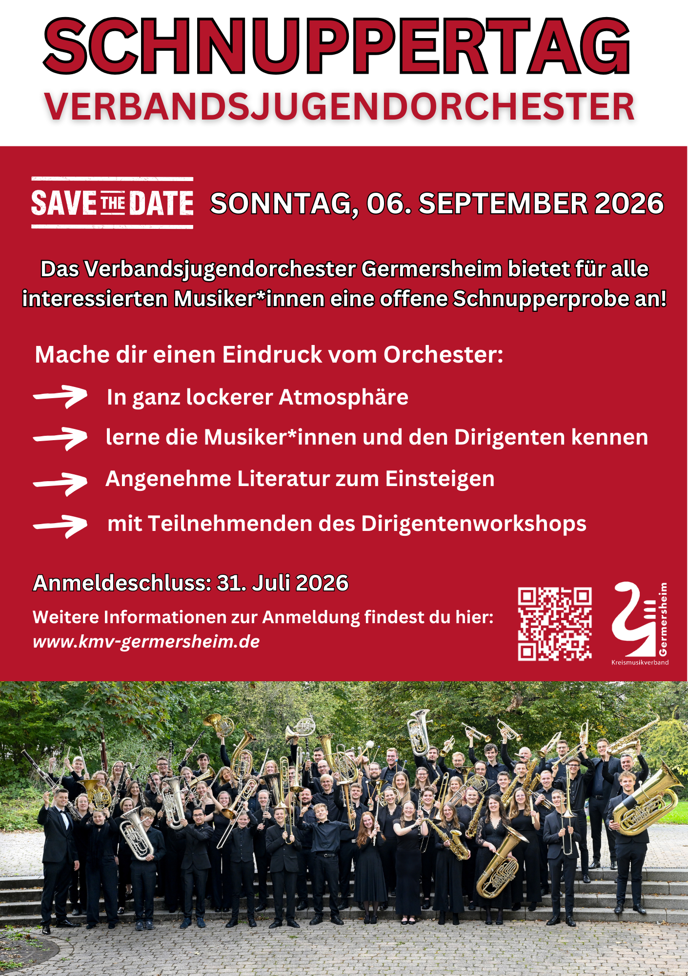 Das Verbandsjugendorchester Germersheim lädt alle interessierten Musikerinnen und Musiker zum diesjährigen Schnuppertag nach Germersheim ein! Unter der Leitung unseres Dirigenten Julian Metzger dürfen alle Teilnehmer das Verbandsjugendorchester und die Musiker näher kennenlernen. Mit leichterer Literatur zum Einstieg möchten wir mit euch am Sonntag, den 06. September 2026 gemeinsam musizieren und euch einen Einblick in unser Orchester geben!