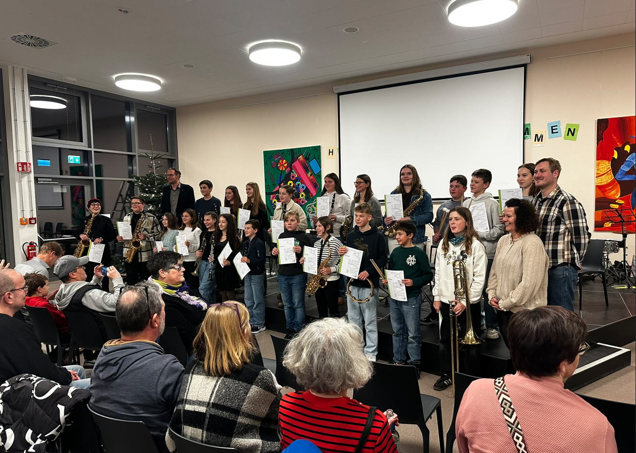 Am Montag, den 01. Dezember 2025 fand die Verleihung der Jungmusikerleistungsabzeichen in Bronze und Silber (Herbstkurs) in der Mensa der IGS Wörth statt. Insgesamt 29 Absolvent*innen aus 10 Vereinen haben die Prüfung im November abgelegt. Das Prüfungsorchester unter der Leitung von Christine Steiner umrahmte die Verleihung mit 3 Stücken vorzüglich.